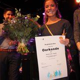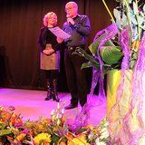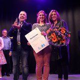 De oogstdankkoningin Saskia Tholen werd verwelkomd, zij assisteerde de wethouders en juryleden bij het huldigen van de winnaars.