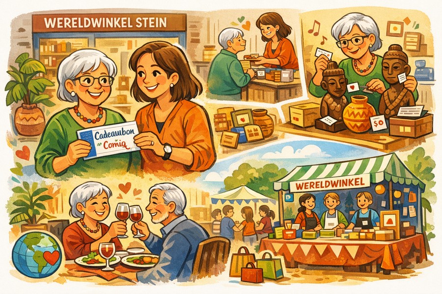 Finie Verheezen, vrijwilligster bij de Wereldwinkel Stein, heeft afgelopen donderdag een extra blijk van waardering ontvangen uit handen van coördinator Ilona. De cadeaubon van Comiq nam zij dankbaar in ontvangst. Samen gaat ze binnenkort genieten van een heerlijk diner.