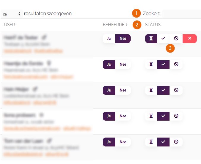 Standaard staan de nog niet geactiveerde deelnemers bovenaan. Bij deze is de knop met de zandloper actief (blauw). - Met de knoppen onder de kolom 'Status', kun je de deelnemer (de)activeren.