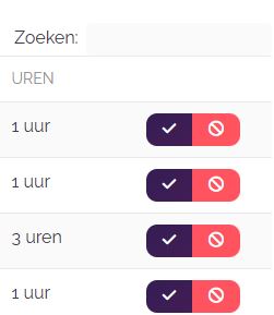 - De knop met het vinkje maakt een deelnemers actief. Deze kan vanaf dat moment uren gaan schrijven.