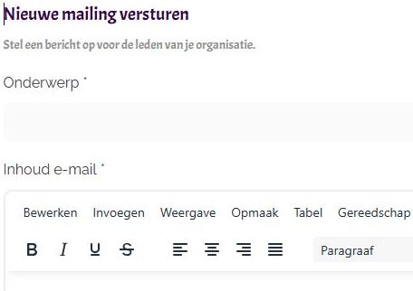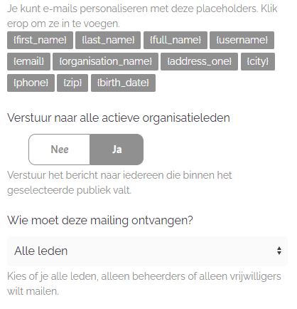 Onder het grote tekstvak heb je een keuzemogelijkheid aan wie je de e-mail wilt versturen. In de meeste gevallen zal dat aan alle actieve organisatieleden zijn.